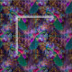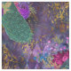 Dieses feine Design zeigt einen wunderschönen aquamarinen und blauen Pfau mit rosa und violetten Blumen auf einem lila Hintergrund mit Goldverzierungen.