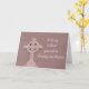 Priester oder Person, die die Pfarrei mit einem cremefarbenen keltischen Kreuz verlasse, und cremefarbene feste Worte. Die Insider-Wörter können geändert werden.