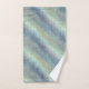 Dieses Set von drei Badezimmertüchern (von denen jedes separat bestellt werden kann), enthält ein Mischung-undmatch Ensemble von den mannigfaltigen Mustern, die auf Pfaufarben basieren: aquamarin, Aqua, Türkis, Gold und Blau. Gerundete Quadrate von einem Entwurf Anzeigen und Kreisformen; anders zeigt die weichen, gewellten, diagonalen Streifen; das dritte kennzeichnet ein modernes, karierten Effekt im gleichen Farbentwurf gekritzelt.