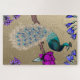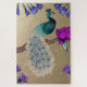 Ein farbenfroher Pfau liegt auf einem Ast mit lebhaften Blume. Der Hintergrund zeichnet sich durch einen goldenen Ton mit texturierten Details aus, der die Eleganz der Szene insgesamt unterstreicht.