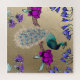 Ein farbenfroher Pfau liegt auf einem Ast mit lebhaften Blume. Der Hintergrund zeichnet sich durch einen goldenen Ton mit texturierten Details aus, der die Eleganz der Szene insgesamt unterstreicht.