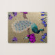 Ein farbenfroher Pfau liegt auf einem Ast mit lebhaften Blume. Der Hintergrund zeichnet sich durch einen goldenen Ton mit texturierten Details aus, der die Eleganz der Szene insgesamt unterstreicht.