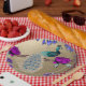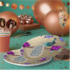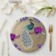 Ein farbenfroher Pfau liegt auf einem Ast mit lebhaften Blume. Der Hintergrund zeichnet sich durch einen goldenen Ton mit texturierten Details aus, der die Eleganz der Szene insgesamt unterstreicht.