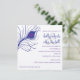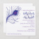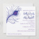 quadratische Einladungskarte mit Pfauenfederbild. dunkelblau mit lila Akzent.