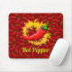 Roter Chili Pfeffer mit Flammenkreis auf herausnehmbarem nahtlosem Musterhintergrund. Eigener Text.