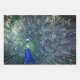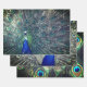 Papierblätter mit 3 verschiedenen Bildern von Pfauen und Pfauenfeder, in kräftigen Farben Blau, Grün und Silber.