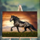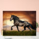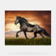 Ein majestätisches Pferd galoppiert über ein Feld als die Sets der Sonne und wirft einen dramatischen Himmel auf. Die Szene erfasst die Schönheit und Energie des Pferdes vor einem Hintergrund lebendiger Farben.