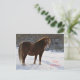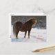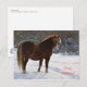 Eine Weihnachtsgrüße Postkarte mit Foto einer kastanienwalisischen Cob Stute mit einem weißen Streifen, im Schnee im Abend Sonnenschein stehend.