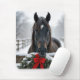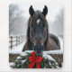 Hinter einem Holzzaun mit festlichem Kranz und rotem Bogen steht ein Pferd, umgeben von einer schneesicheren Winterlandschaft