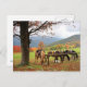 Pferde trafen auf einem Berggipfel mit Bergen und fallen Blattwerk im Hintergrund.
