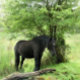 Ein schönes schwarzes Pferd, das im Schatten eines Baumes ruht. Wasserfarbe Wales UK.