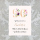 Ein pfirsichfarbener Hintergrund. Dekoriert mit Foralzahlen in Imitaten Gold und Rosa. Personalisieren und fügen Sie einen Namen und Alter.