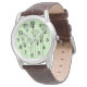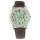 Diese Herren-Uhr hat ein modernes Design aus Pflanze, die aus Linien, Kreisen, Dreiecken, Rechtecken und Quadraten in schwarz auf grünem Hintergrund bestehen.