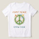 Dieser T - Shirt besticht durch ein lebendiges, grünes Friedenssymbol, das mit Weinreben, Blume und Schmetterlingen blüht.