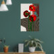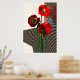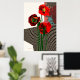 Mod Mohndesign in fett- und schwarz. Muster auf Mustern, um Blumenformen zu schaffen. Geometrische Winkel definieren drei Pole in einer Vase.
