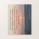 Jigsaw Puzzle mit inspirierender Zitatskriptur zeigt ein schönes Foto eines goldenen Sonnenuntergangs über blauem Meer. Es zeigt eine ermutigende Bibel Verse Philippianer 4:6: "Sei nicht ängstlich oder sorge dich um irgendetwas, aber in allem, durch Gebet und Petition mit Erntedank, weiterhin deine Wünsche Gott bekannt zu machen."