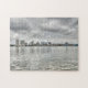 Hier ist die wunderschöne Philadelphia-Skyline, die von der anderen Seite des Delaware-Flusses in der Stadt Camden zu sehen ist. Wolken hängen über dem stürmischen Himmel, und die Spiegelungen der Wolkenkratzer sind im Wasser zu sehen.