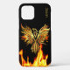 coque iphone d'Imaginaire fait en noir, avec des graphismes cool d'un Phoenix doré à l'air métallique flamboyant, montant du feu. Le texte personnalisé, en haut, est prêt à personnaliser pour vous-même ou comme une idée cadeau exceptionnelle à votre fan d'imaginaire préféré.