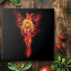 Eine Frau, die mit Flügeln falsch ist. Eine Phoenixfrau in rot, gelb und orange Flammen in einem Hintergrund von schwarz.