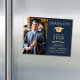 Elégante carte magnétique de faire-part de diplôme de l'université bleu foncé avec une photo du diplômé, un casquette de grade d'or, le nom de la diplômée dans la typographie classique de serif d'or, et leur école, major, distinctions ou plans futurs.