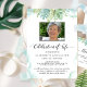 Mes condoléances pour votre perte. Exquise Verdure Photo Service Memorial, Service funéraire carte d'invitation Faire-part. Une façon pratique et délicate d'informer la famille et les amis des funérailles ou des plans de rassemblement célébrant la vie de votre être cher disparu. Carte avec une photo adorée présentée avec une belle verdure et arrière - plan aquarelle dans un mélange de bleu turquoise pâle et de tons verts. Utilisation de détails de calligraphie écrits à la main modernes. Dos de carte dans un élégant ton bleu clair turquoise. Guide de coordination des funérailles. Une partie de nos produits funéraires.