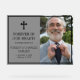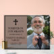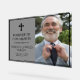 Symbole acrylique de service funéraire chrétien avec une croix noire, Forever dans nos coeurs et les noms et les années de votre être cher vivant imprimé en polices noires contre un arrière - plan acrylique noir transparent à côté d'une photo de votre être cher. Noir transparent pour toujours dans nos coeurs signe acrylique pour un service commémoratif personnalisé avec une photo de votre être cher.