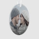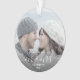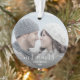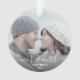 Commémorez le premier Noël de votre mariage avec ce magnifique ornement de gardiens moderne. Le texte blanc dit "Notre premier Noël en tant que Monsieur et Madame", avec les mots "Monsieur et Madame" dans un élégant script d'écriture avec des fioritures avant et après. Remplacez l'exemple d'image par votre photo préférée, et ajoutez votre nom de famille et l'année. Un filtre dégradé foncé permet de faire apparaître le texte.