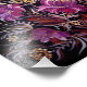 A vibrant painting of lilac flowers on a dark background in the traditional Petrykivka style. The composition features intricate floral patterns, with delicate, sweeping brushstrokes that create a sense of movement and elegance. The flowers are surrounded by ornate leaves and small decorative details in shades of green, yellow, and white, contrasting beautifully with the dark backdrop