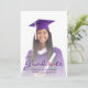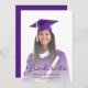 Faire-part moderne de graduation avec une photo verticale personnalisée. Le mot "Graduate" apparaît dans le script violet, avec le nom du diplômé, l'école et l'année de graduation ci-dessous dans la police sans serif. Remplacez facilement l'image de l'échantillon par la photo de votre diplômé. Un écran de dégradé blanc permet de s'assurer que le texte s'affiche. L'inverse est violet solide. Idéal pour obtenir un diplôme d'études secondaires ou collégiales.