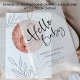 Photo simple feuille Faire-part de naissance fille bébé. Disponible numériquement et imprimé. Peut également être utilisé comme arrière - plan pour les recouvrements de vellum disponibles dans cette collection. Un design contemporain simple pour annoncer l'arrivée de votre petite fille. Remplacez simplement l'exemple de photo par votre propre photo de votre nouvelle arrivée qui est dans une forme de masque circulaire et personnalisez facilement le texte à l'arrière. Avec des feuilles de trait simplistes.