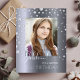 Une invitation à une fête d'anniversaire surprise. Modèle pour votre propre photo. A l'avant : Représentation de texte blanc : Shhh ! C'est une surprise. Le texte est écrit avec un script de style moderne écrit à la main. Texte : 21e anniversaire (ou tout âge). Décoré avec un faux sprinkle de diamant. Faux argent foncé à l'arrière - plan métallique. Dos : arrière - plan métallique faux argent, quelques faux diamants et des lettres de couleur noire. Modèles pour un nom et les détails de la fête.