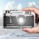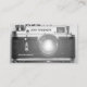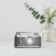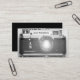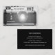 Carte de visite avec une image en noir et blanc d'un appareil photo avec un effet de reflet de lentille. Idéal pour un photographe.
