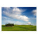 Photographie d'un groupe de cyprès dans un paysage de collines vertes et de fleurs jaunes sous de beaux nuages blancs près de Torrenieri dans le Val d'Orcia (vallée de l'Orcia) en Toscane, Italie.