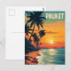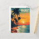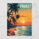 Dieses wunderschöne Vintage Poster zeigt den tropischen Reiz Phukets bei Sonnenuntergang. Die silbernen Palmen erstrecken sich über einen goldenen Strand, der in warmen Retrotönen in Orange und Rosa strahlt. Die nostalgische Konsistenz und die Vintage Farbpalette zeugen von der Essenz eines friedlichen thailändischen Paradieses, das sich perfekt für den Geist von Reisen aus der Mitte des Jahrhunderts und exotischer Entspannung eignet.