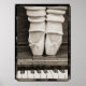 Ein schönes sepia tonisiertes Stillleben Foto von Ballettschuhen en pointe auf einer aufrechten Klaviertastatur, umgeben von einem grafischen Rahmen im polaroiden Stil. Das große Poster ist 30 x 42 Zoll oder 76 1/4 x 106 1/2 cm