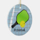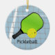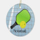 Pickleball Design Ornament avec du texte personnalisable des deux côtés. Le Pickleball est un sport de raquette et de pagaie qui a été créé en combinant des éléments de plusieurs autres sports de raquette. Deux ou quatre joueurs utilisent des pagaies solides pour frapper une boule de polymère perforée (comme une boule de torsion) sur un filet.