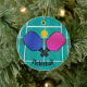 Pickleball Design Ornament mit anpassbarem Text auf beiden Seiten. Pickleball ist ein Schläger-/Paddelsport, der durch die Kombination von Elementen verschiedener anderer Schlägersportarten entstanden ist. Zwei oder vier Spieler benutzen solide Paddeln, um einen perforierten Polymer Ball über ein Netz zu schlagen.