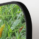 Ein Black, Pickleball Paddle, (Standard), mit einem Cover=(optional)=kann sich unter Change-Optionen ändern, mit einem schönen Bild eines Monarchen Butterfly, auf dem Gras, auf dem Bild umgekehrt auf der Rückseite von Paddle, (Bild von P.J.M.), mit einer Offiziellen USA Pickleball Zertifizierung in der Farbe weiß, auf ihr.