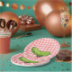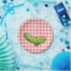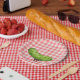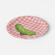 Pappteller mit der Ameise, die eine Essiggurke wegschafft. Teil der Sommer-Picknick-Sammlung.