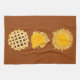 Pie Turkey Pie vertical dk serviette de cuisine citrouille, art par Kristie Hubler, avec tarte citrouille qui a le bord de croûte feuilleté, une dinde Thanksgiving rôtie, et un treillis pâtisserie à croûte bleuet tarte