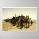Dieses Bild ist von Pilgern auf ihren Reisen nach Mekka. Es gibt Leute auf Kamelen und einige weckend. Einige tragen Flaggen, während sie durch die Wüste reisen.