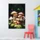 In einem üppigen Wald sind verschiedene Pilze abgebildet, von denen einige mit weißen Kappen und andere mit roten, orangefarbenen oder braunen Kappen versehen sind. Die Pilze sind in einem Halbkreis angeordnet, deren Stiele aus einem grünen Moosbett und Blätter hervorgehen. Der Hintergrund ist ein dunkler, schattiger Wald mit Sonnenlicht, das durch die Blätter strömt und die Pilze beleuchtet.