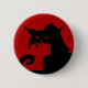 Eine schwarze Katze mit spitzen Fellen und durchstechenden roten Augen sitzt vor einem tiefen roten Hintergrund. Seine Augen scheinen zu leuchten und verleihen seinem bereits geheimnisvollen Aussehen eine unheimliche, übernatürliche Qualität.
