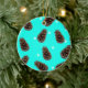 Naturbraune Kiefernzapfen mit kleinen Schneeflocken auf einem hübschen aquafarbenen Hintergrund. Fügen Sie Ihrem Weihnachtsbaum etwas kühn Farbe hinzu.