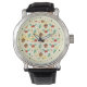 Eine Armbanduhr mit niedlichem Muster mit Kiefernfüßen und heilig auf einem gelben Aquarellhintergrund mit kleinen, weißen Kreisen, die verstreut sind.
