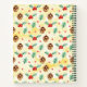 Spiralheft mit niedlichem Muster mit Kiefernfüßen und Heiligem auf gelbem Aquarellhintergrund mit kleinen weißen Kreise, die rund verteilt sind.