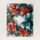 Ein Rätsel mit einem hübschen Weihnachtskranz. Ein festliches Bild mit einem Kiefernkranz mit roten Blume, Heiligenschein und einem schönen blauen Bogen. Schön.