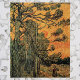 Pine Trees against a Red Sky with Setting Sun by Vincent van Gogh ist eine Vintage Kunst Post-Impressionismus Landschaft Natur Malerei. Ein Kiefernwald mit leuchtend rotem und orangefarbenem Himmel bei Sonnenuntergang. Die Sonne scheint durch die immergrünen Zweige, Kiefernzapfen und Nadeln in der Wildnis. Über den Künstler: Vincent Willem van Gogh (1853-1890) war einer der berühmtesten postimpressionistischen Maler seiner Zeit. Seine Arbeit war besonders für seine raue Schönheit, seine emotionale Ehrlichkeit und seine kühne Farbe bemerkenswert.