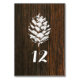 Carte de place du numéro de table mariage avec une illustration de cône de pin sur un arrière - plan inspiré du bois d'écorce.