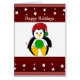 Un mignon petit pingouin dans un casquette de Noël rouge tenant un ornement de vacances vert. Une bordure de rouge profond aux étoiles blanches l'accentue.